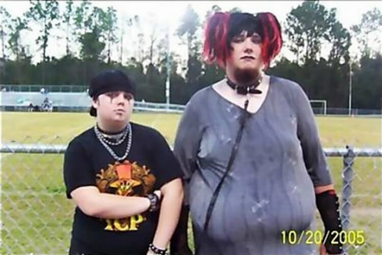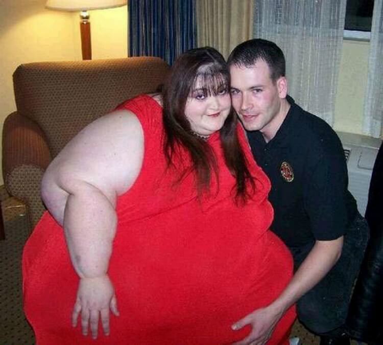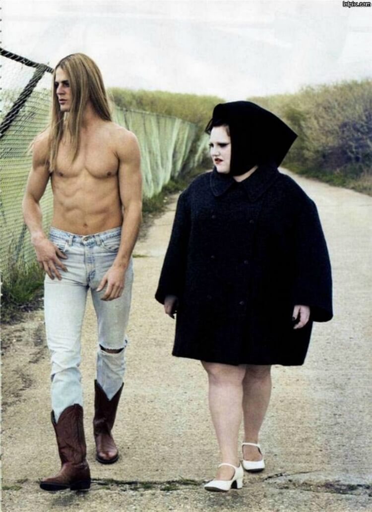 Парень модельной внешности и его подружка размера плюс в траурном костюме.